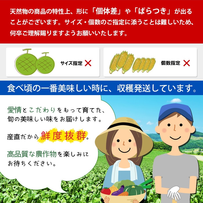 - 農作物のため、生育状態によっては、ご案内期間内にお届けできない場合がございます。