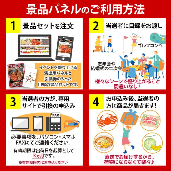 「豪華でインパクトのある景品が欲しい」「幹事として失敗したくない」そんなニーズに応える、グルメギフト景品の決定版。会場でパネルを掲げれば「おっ!」と歓声が上がること間違いなし。