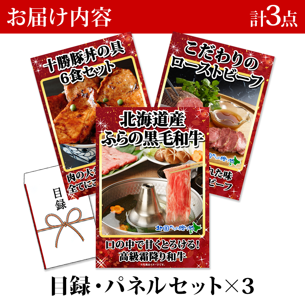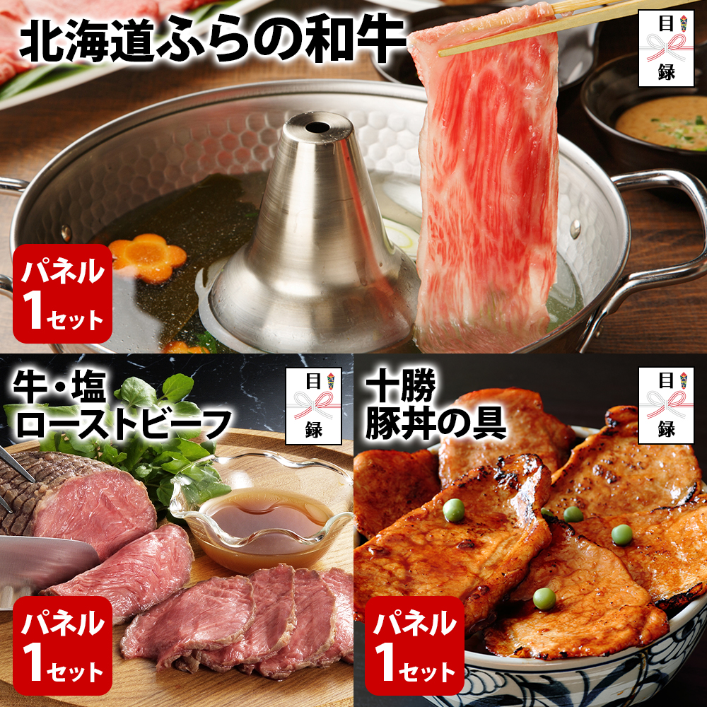 グルメギフト券【目録】北海道の肉3点セット 北海道/ふらの和牛/ローストビーフ/十勝豚丼/豚丼の具/ ビンゴ 結婚式 二次会 お肉 ゴルフコンペ 肉 ギフト券 目録 景品 パネル 肉 景品ギフト券 パネル付き 目録 景品パネル付 宴会 新年会 景品 送別会 2次会 gift 送料無料