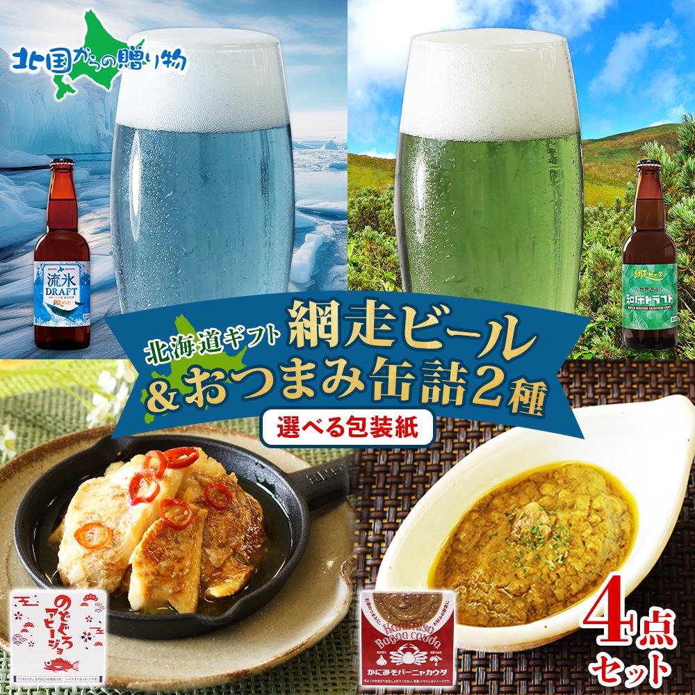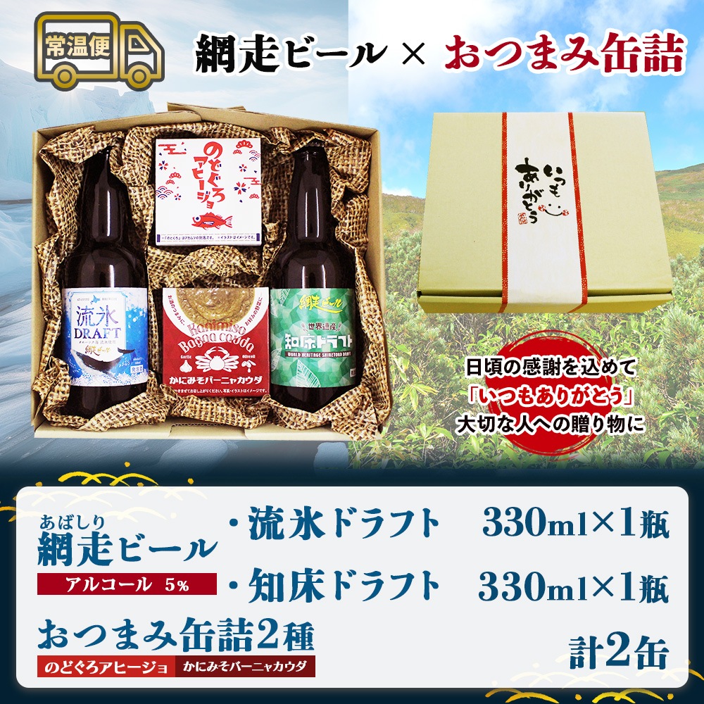 網走ビール おつまみ セット /網走ビール(流氷ドラフト/知床ドラフト) と おつまみセット(缶詰おつまみ2種) 北海道 地ビール クラフトビール ギフト 父の日 ビール おつまみ セット 母の日 ビール お酒 おつまみセット 送料無料
