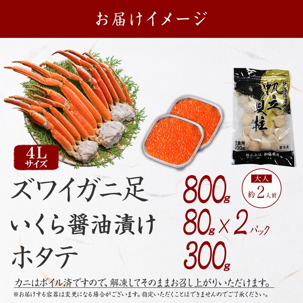 ズワイガニ足800g いくら醤油漬け80g×2 ホタテ300g セット 蟹 かに ズワイ ずわいがに ズワイガニ 脚 足 茹で カニ ボイル いくら イクラ 醤油漬け 帆立 ほたて ホタテ 新鮮 冷凍 海鮮 誕生日 正月 お祝い 特別 ギフト グルメ お取り寄せ 送料無料 北国からの贈り物