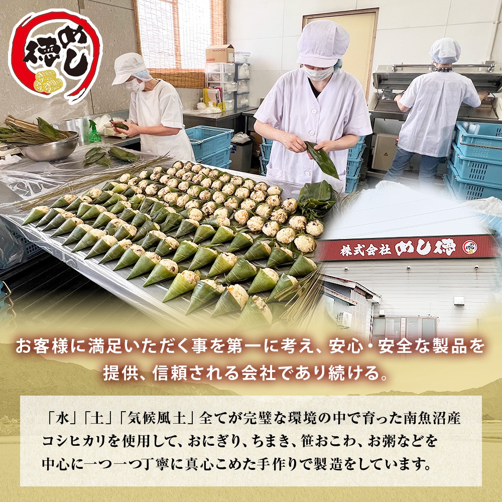 こだわりの製法で炊き上げ、味付けした笹おこわは、最大の特徴である笹も一枚一枚丹念に手摘みした地元魚沼産の笹を使用。ベテランの職人が一つ一つ丁寧に手作業で包んでいます。