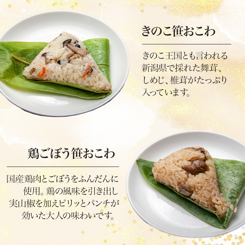 国産鶏肉とごぼうをふんだんに使用した「鶏ごぼう笹おこわ」。アクセントに実山椒を加え、ピリッとパンチが効いた大人の味わいです。