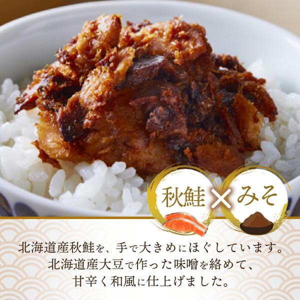 北海道産秋鮭の荒ほぐし身を、北海道産大豆で作った味噌を絡めて味付けしした、味噌味の鮭荒ほぐし 3個セットです。