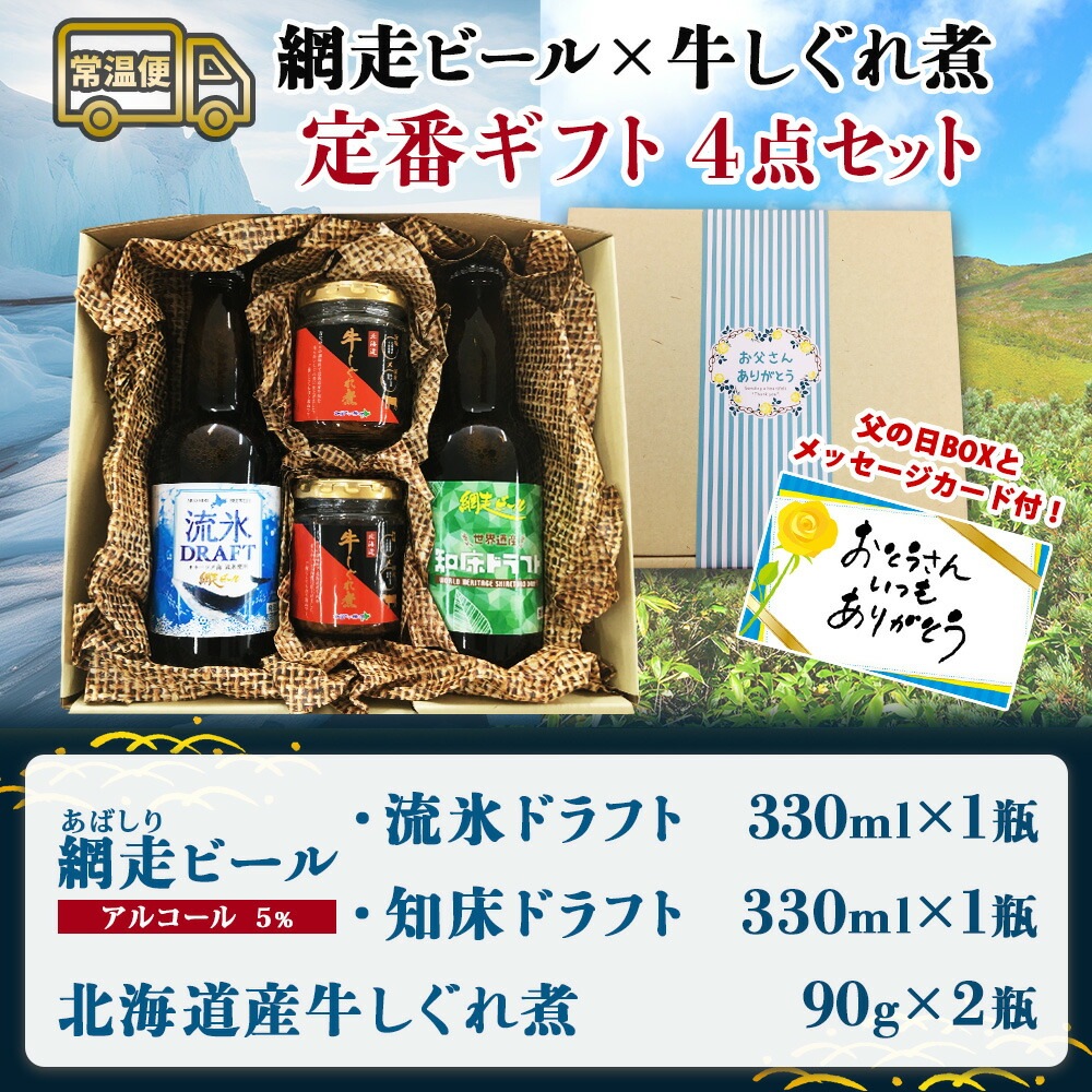【父の日ギフト】 網走ビール&牛しぐれ 計4瓶 メッセージカード付き 北海道 ビール 流氷 知床ドラフト 濃厚 牛しぐれ煮 国産 牛肉 父の日 ビール おつまみ セット お酒 緑色 青色 酒 映え 話題 人気 お取り寄せ グルメ プレゼント 食べ物 ギフト 送料無料 北国からの贈り物