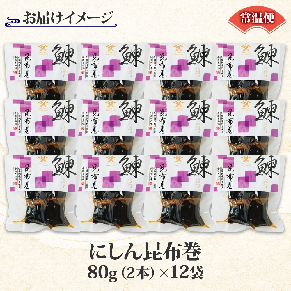 北海道 にしん昆布巻 約80g 12袋 北海道産 にしん 昆布巻き 鰊 ニシン 昆布巻 煮物 国産 お酒 お供 惣菜 おかず 人気 定番 和食 ごはんのおとも ご飯のお供 ギフト お酒の おつまみ お取り寄せ グルメ 送料無料 常温 タカハシ食品 函館市