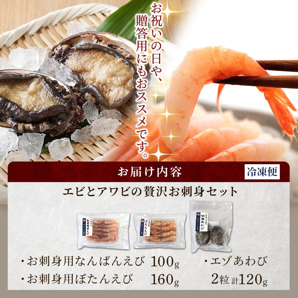 年末指定可 お歳暮 豪華 北海道産 エビとアワビのお刺身セット お刺身用 なんばんえび ぼたん蛯 エゾあわび 2粒120g アワビ 海老 蝦夷 鮑 蝦夷あわび 蝦夷アワビ ボタンエビ 刺身 東しゃこたん 高級 積丹 ギフト 魚介 海鮮 お取り寄せ お正月 グルメ おせち 送料無料