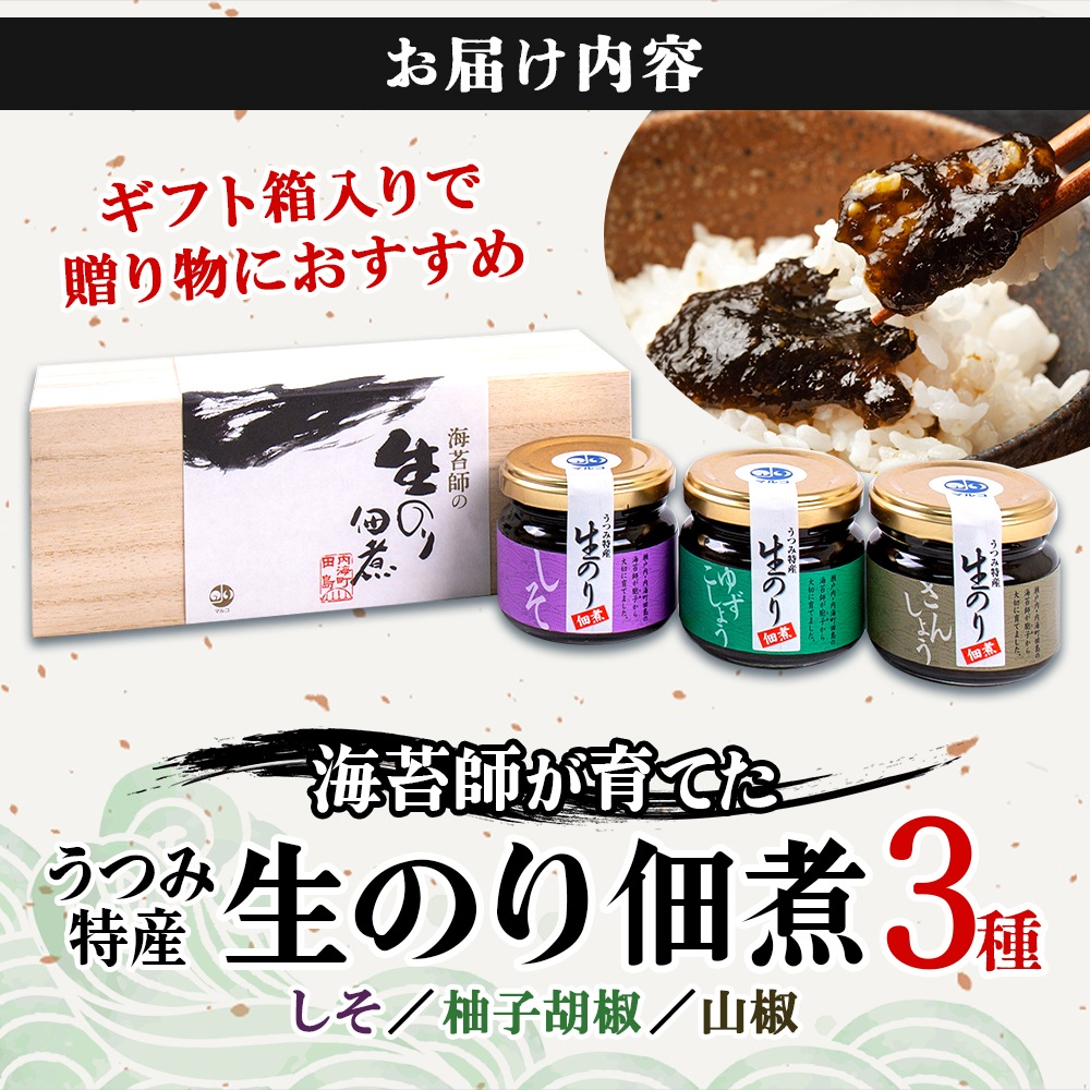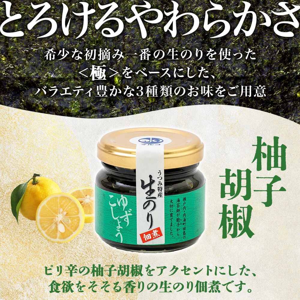 高級 生のり佃煮 柚子胡椒 しそ 山椒 生のり 3個セット 海苔 のり ノリ 海藻 ギフト箱 桐箱入り 3種 食べ比べ ギフト箱入 瀬戸内 名産 生海苔 佃煮 ギフト 御歳暮 冬ギフト お歳暮 佃煮 詰め合わせ 海苔佃煮 のり佃煮 セット 取り寄せ 手土産 お取り寄せ マルコ水産 gift set