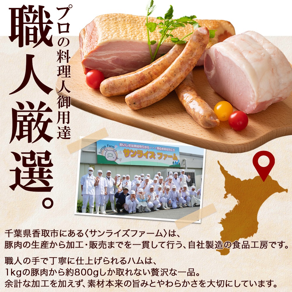 千葉県香取市にあるサンライズファームは、豚の飼育から加工・販売までを自社で一貫して行う、こだわりのハム・ソーセージ工房です。