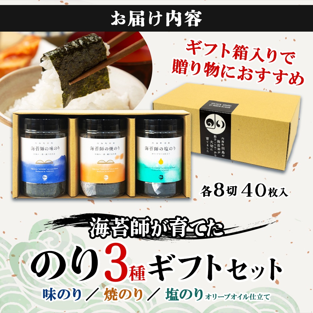 SETOUCHI SEAWEED 味のり 焼のり 塩のり 3本セット 3種 食べ比べ オリーブオイル ギフト箱付 初摘み 海苔 のり ギフト箱 3種 瀬戸内海 焼き海苔 寒中見舞い お年始 御年賀 お年賀 お歳暮 海苔 詰め合わせ 焼海苔 焼きのり ギフト 味付海苔 味海苔 高級 マルコ水産