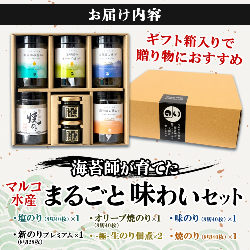 マルコまるごと味わいセット 6種セット 食べ比べ ギフト箱付 生のり 焼のり 味のり 塩のり オリーブオイル 寒中見舞い お年始 御年賀 お年賀 ギフト 海苔 佃煮 のり 佃煮 瀬戸内海 名産 生海苔 味海苔 味付海苔 贈り物 お歳暮 海苔 詰め合わせ ギフト 高級 マルコ水産