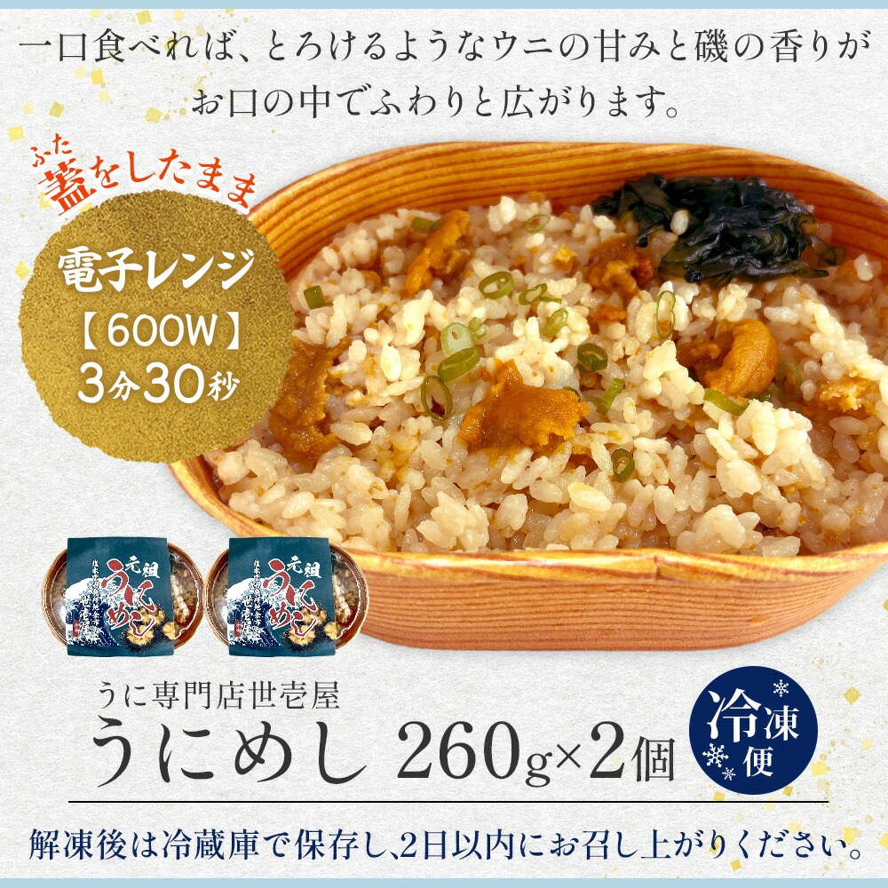 元祖うにめし 260g 2個 うに専門店 世壱屋 北海道産 ウニ ウニめし 雲丹めし うに飯 ウニご飯 北海道 ウニ うに 冷凍 ウニ 国産 ウニ ミョウバン不使用 無添加 成人式 寒中見舞い お年始 御年賀 お年賀 海鮮 丼 北海道 余市町 ギフト箱 お歳暮 お年賀 うに ギフト